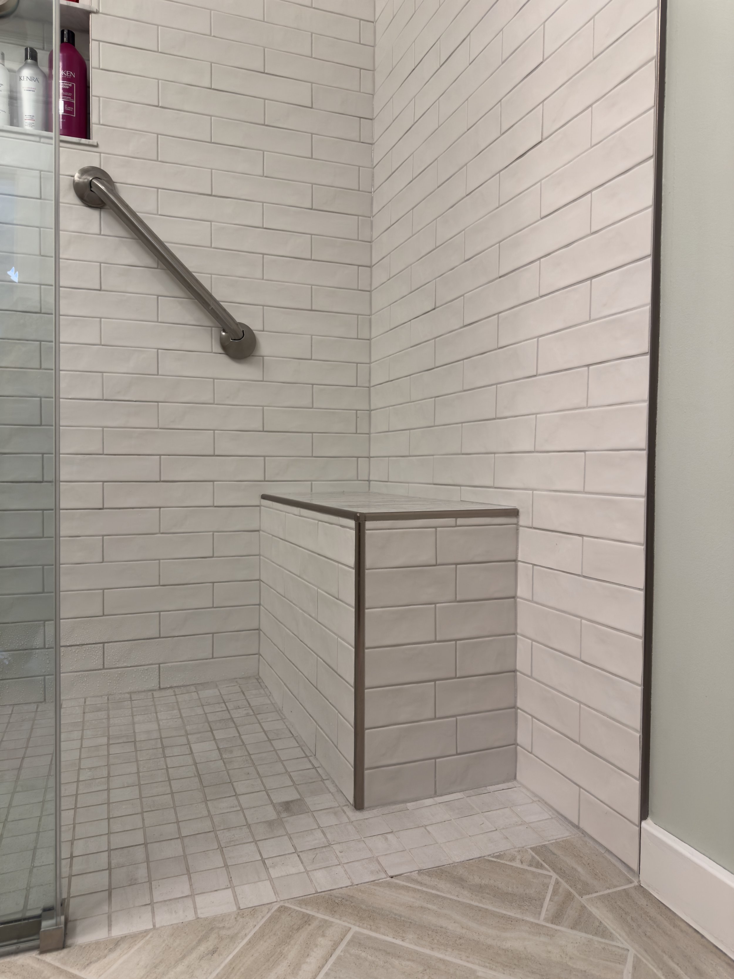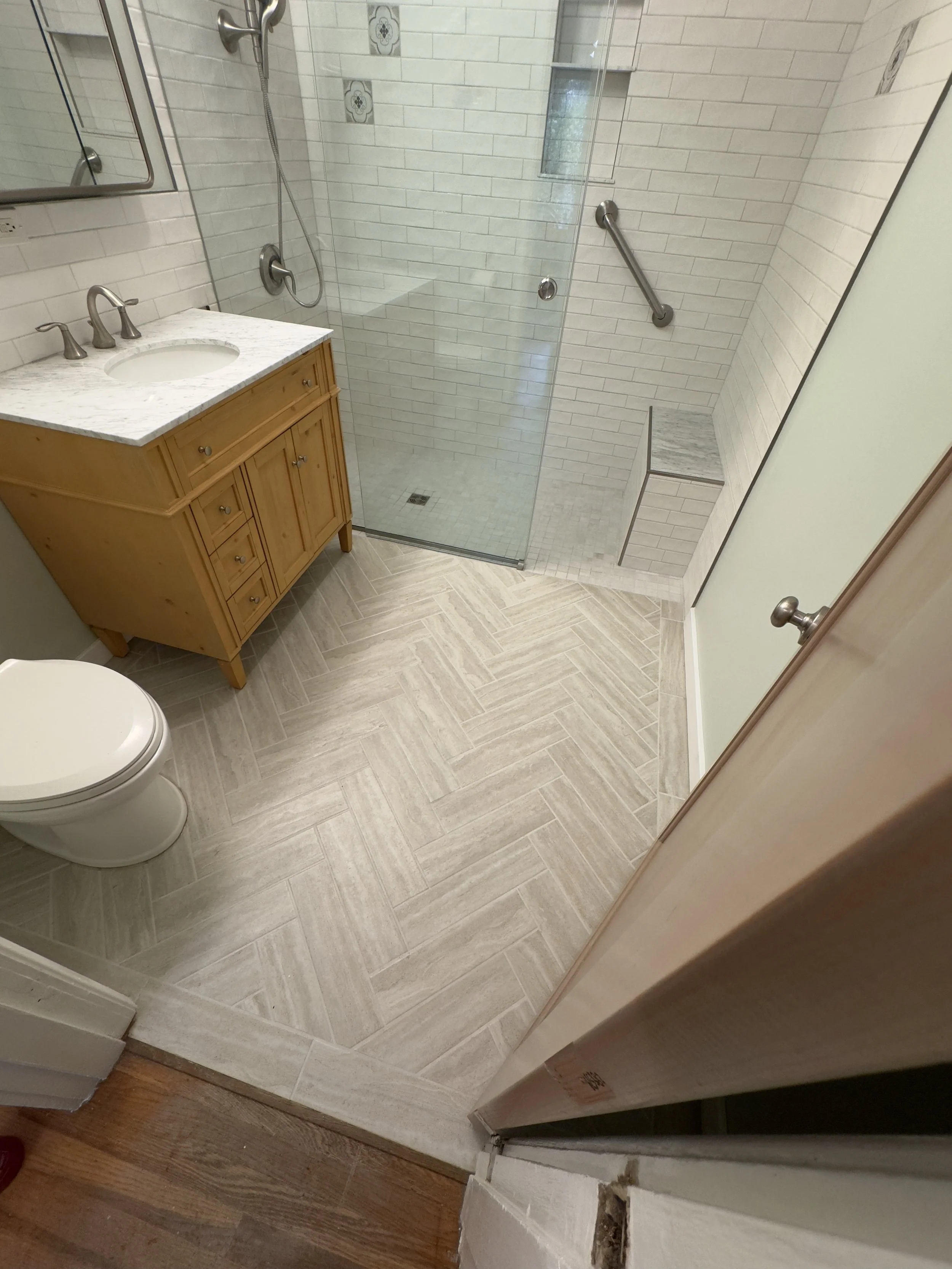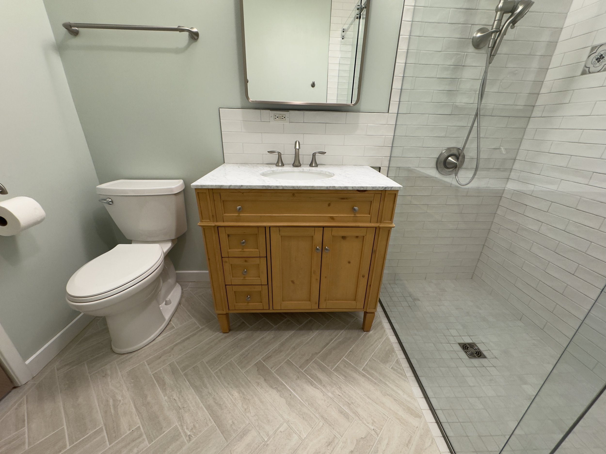 This remodel centered on creating a safer, more comfortable bathroom for aging in place. The layout was simplified for easier movement, accessibility features were integrated subtly, and warm, timeless materials were chosen throughout. A curbless walk-in shower, marble accents, nickel trim, and a herringbone tile floor add refinement while keeping the space calm, familiar, and easy to use.
